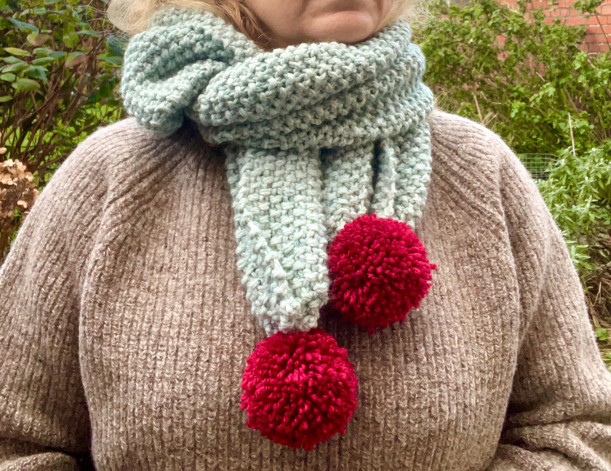 Hand knitted pom pom scarf, beautifully soft.