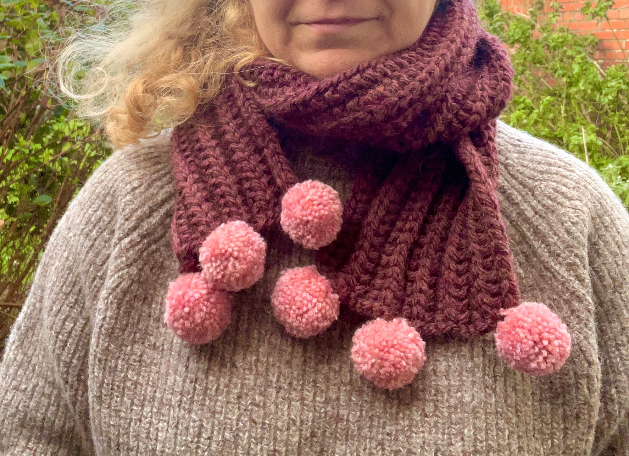 Hand knitted pom pom scarf, beautifully soft.
