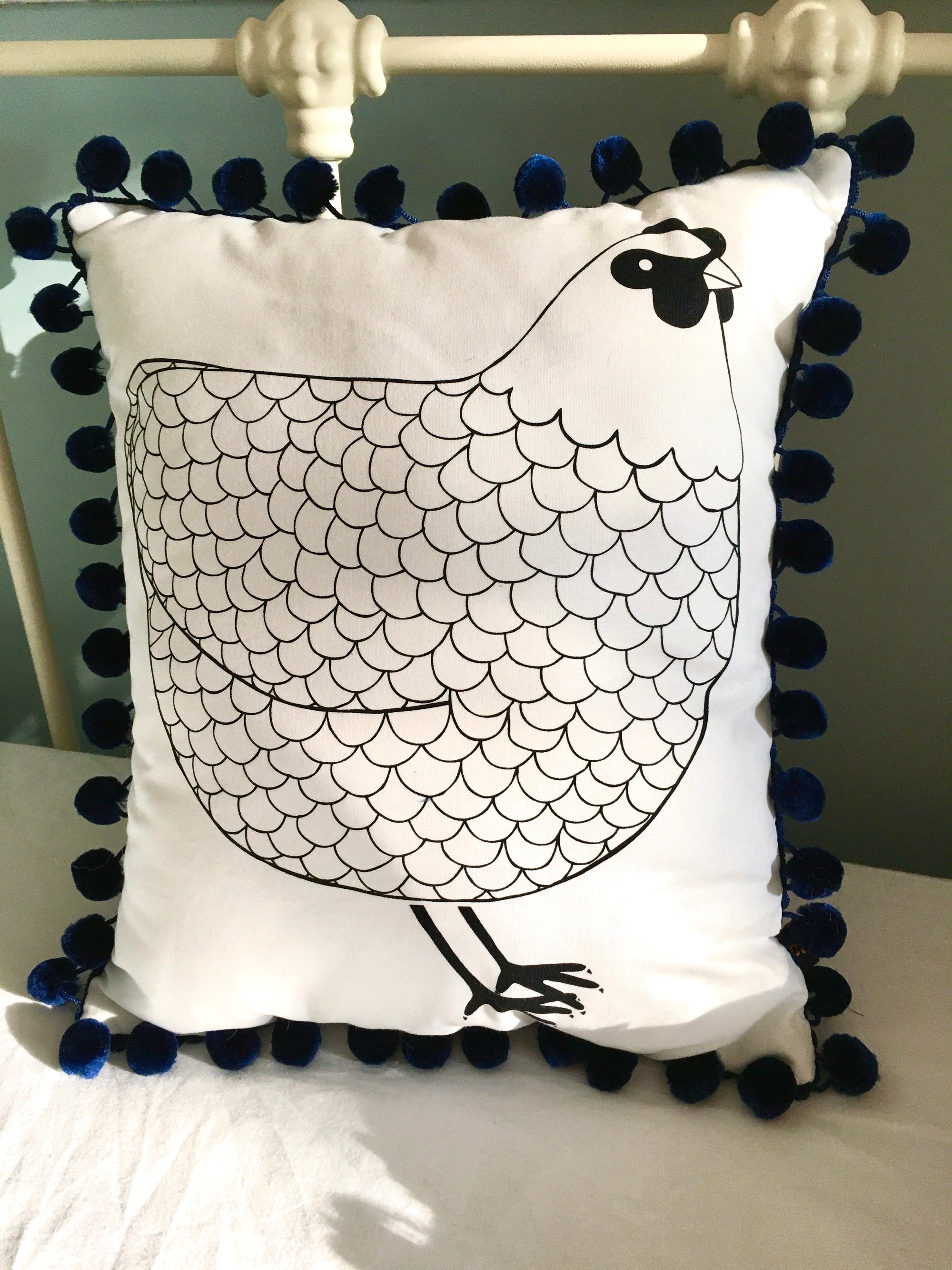 Beautifully illustrated handmade farmyard animal cushions with a blue back and pom pom trim.