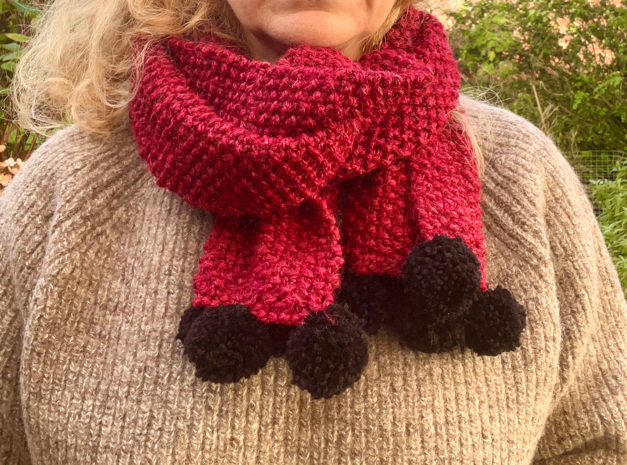 Hand knitted pom pom scarf, beautifully soft.